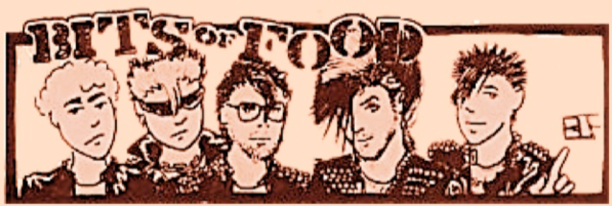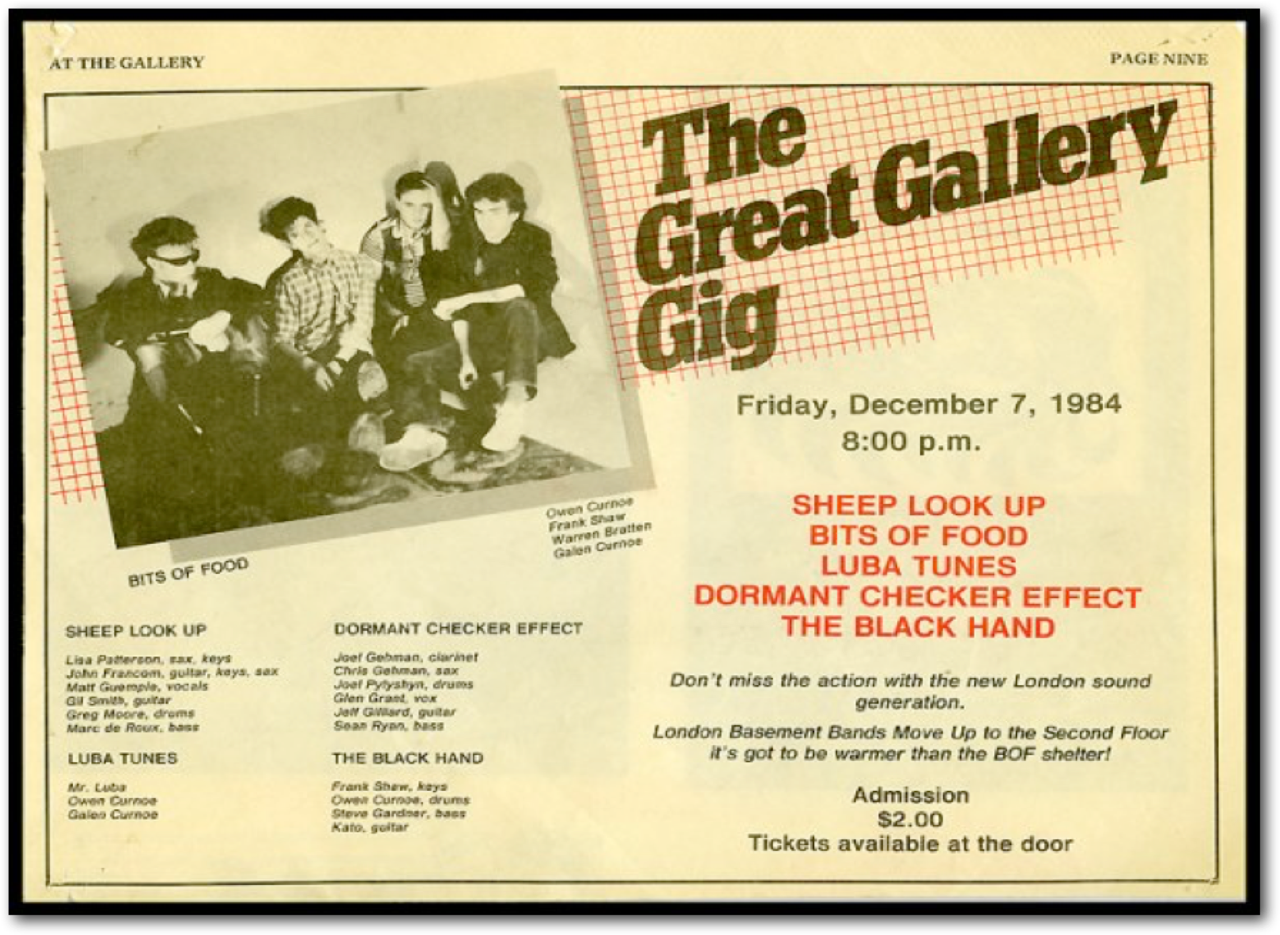 BITS OF FOOD(1982-1985) with Charles Vincent on vocals/bass, Warren Pratten on guitar, Galen Curnoe on drums/guitar, Owen Curnoe synth/drums. Frank Shaw joined the band to provide vocals and bagpipes.